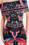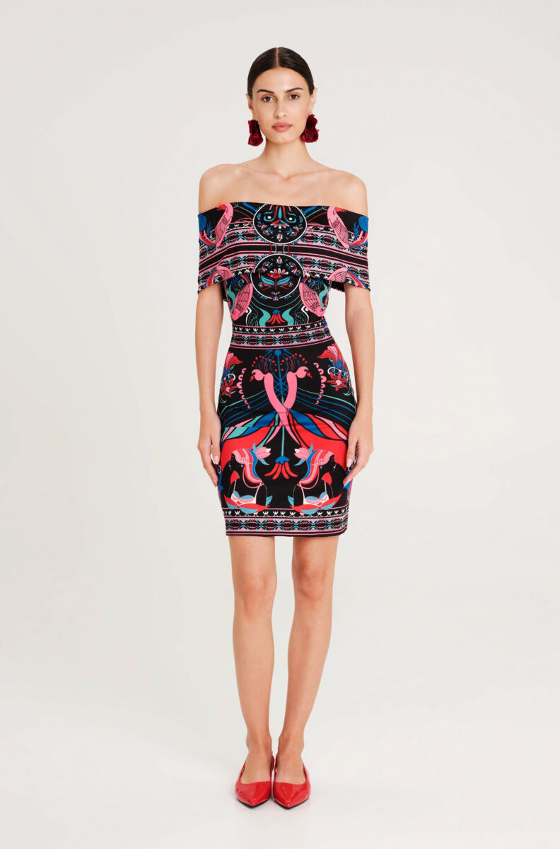 In celebration of all things feminine and beautiful, our Cosmology Bodycon Dress features Art Nouveau-inspired motifs bordered with elements of folk art. Its placement print uses bold colours and delicate details to depict female figures, florals and paired birds. This off the shoulder mini dress sits close to the body and features a wrap effect back detail.