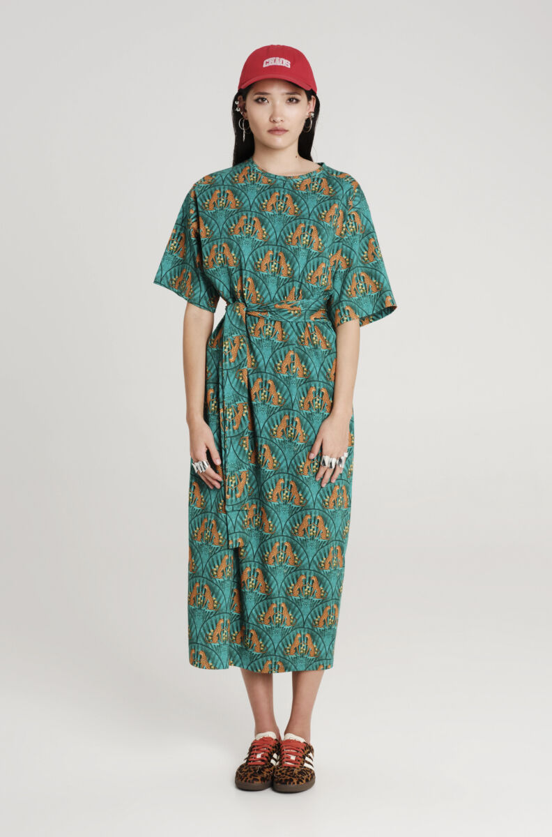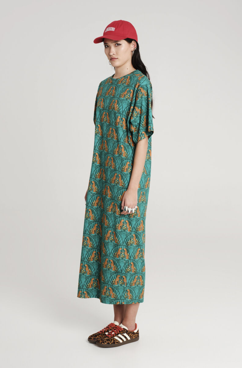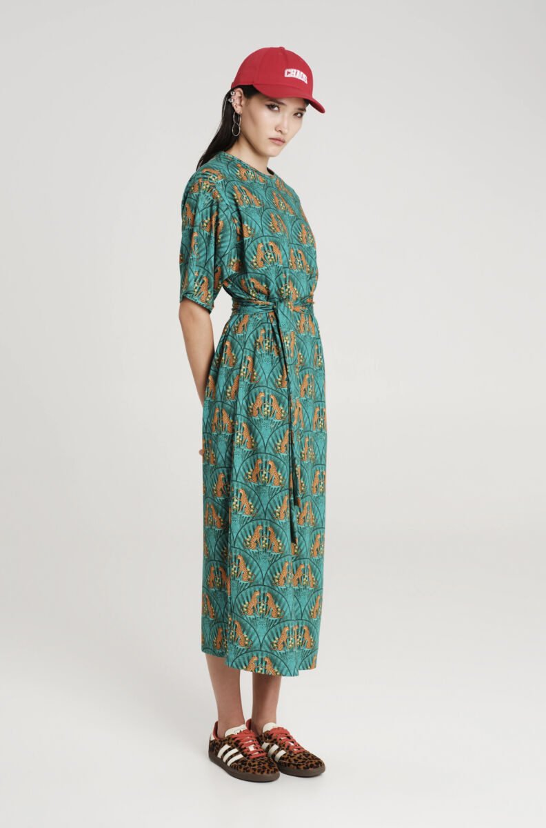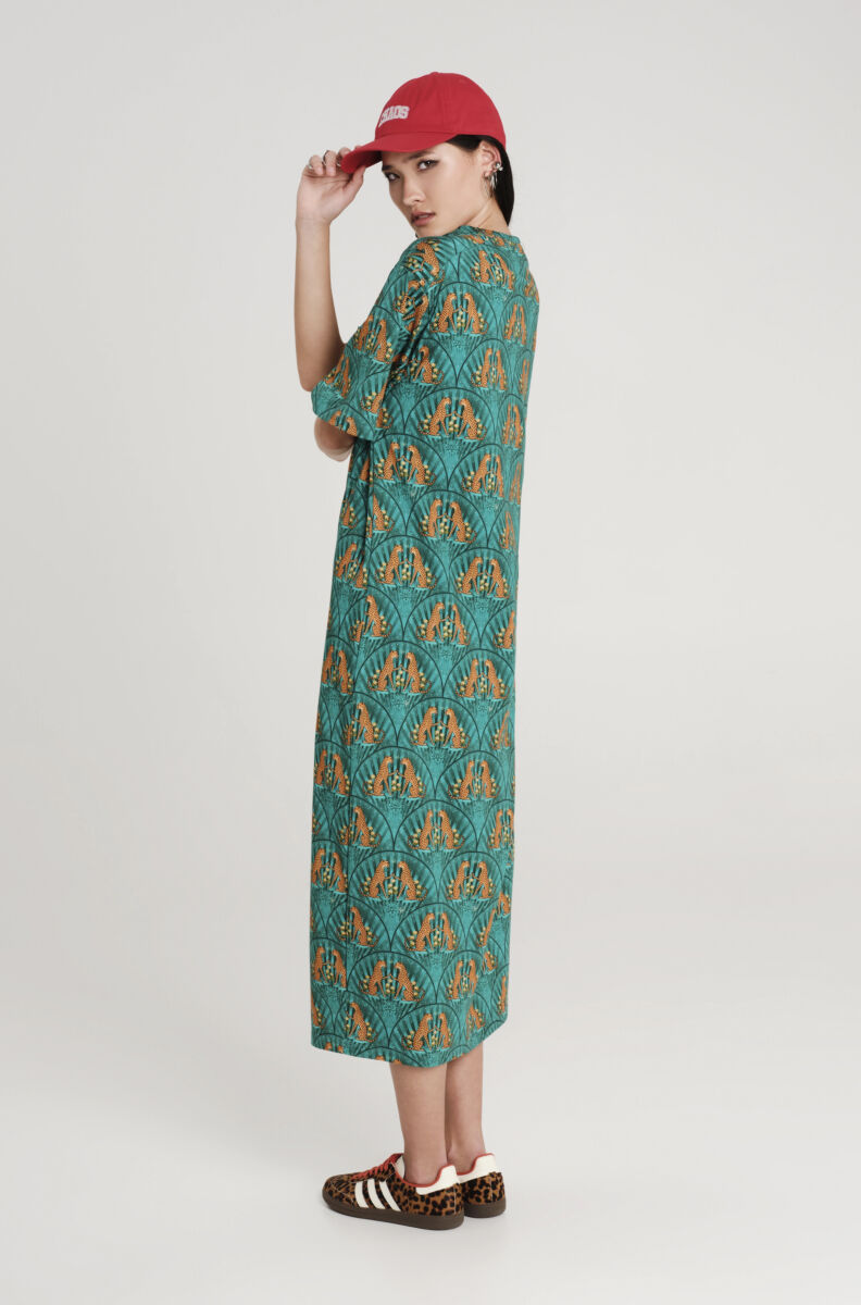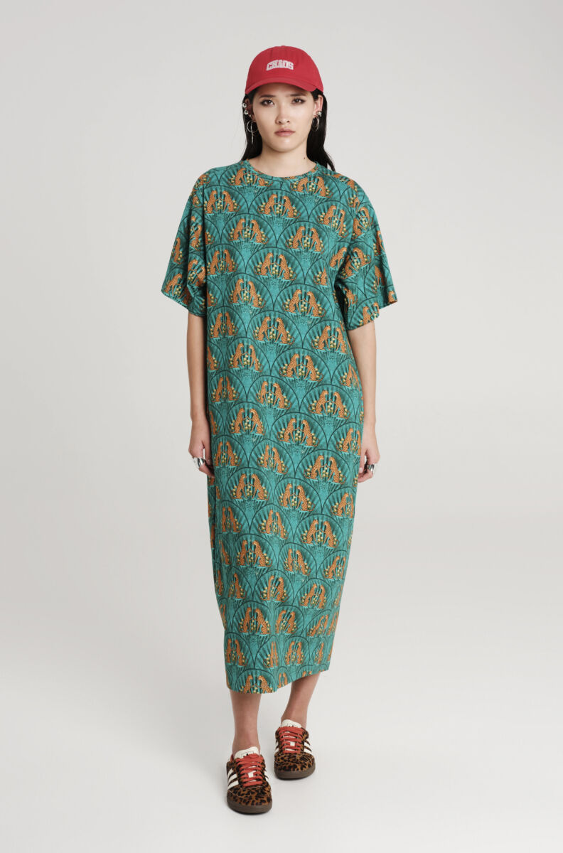 Boxy or belted, our Emerald Dress is designed for a relaxed fit. A special P+C woven label and feline all-over print gives powerful energy while cotton jersey gives this t-shirt dress soft structure. Wears yours as a comfortable statement piece for everyday dressing with style.