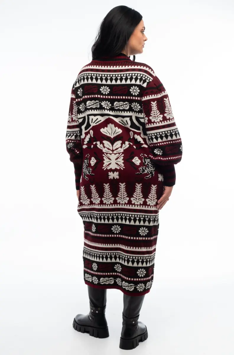 Cozy and romantic, our Mythical Long Dress has Juliet sleeves and contrast knit cuffs and neckline. This sweater dress features a folk-inspired print in ecru and black on warm red and a comfortable fit. Wear it as a statement dress on cool winter days.