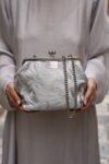 For the safety, this hand bag has been designed with a silver, frame kiss closure.