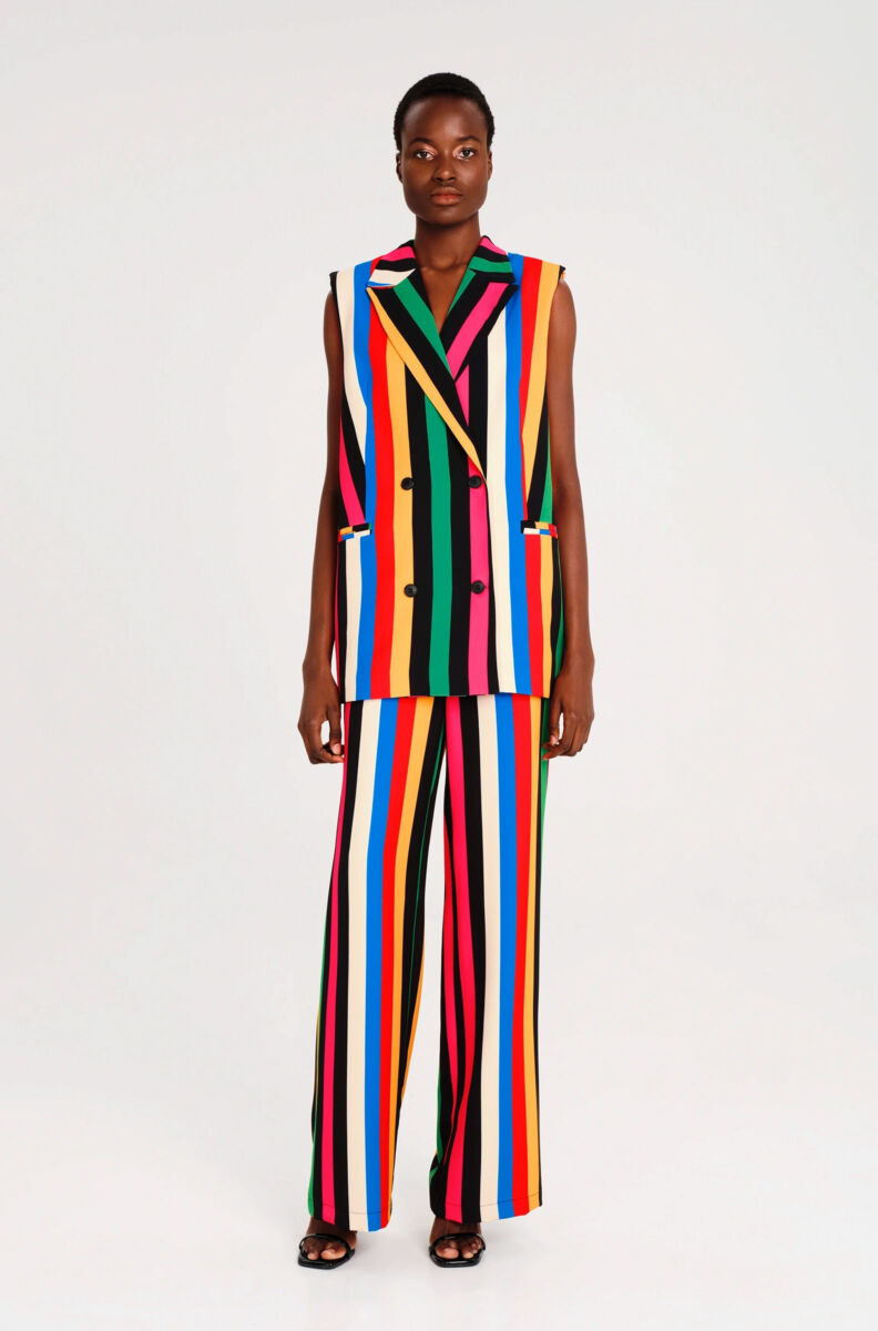 Our Rhythm Sleeveless Blazer has an all-over print of bold and colourful stripes. This double breasted, long vest features tailored details like lapels, satin lining and double jetted pockets. It has a P+C metallic Chaka detail as a talisman. For fresh Spring suiting, wear yours with matching Rhythm Pants and a Dreamlike Shirt..